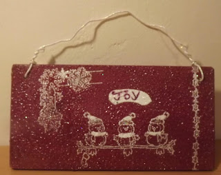So between my painting sessions I have made these hanging signs, I thought I would share with you. I used a variety of stamps including, Woodware "Partridge ina pear tree", Hero Arts, Penny Black etc. Embossing powder, acrylic paint, pretty wire, Glamour Dust glitter, inks and bells.